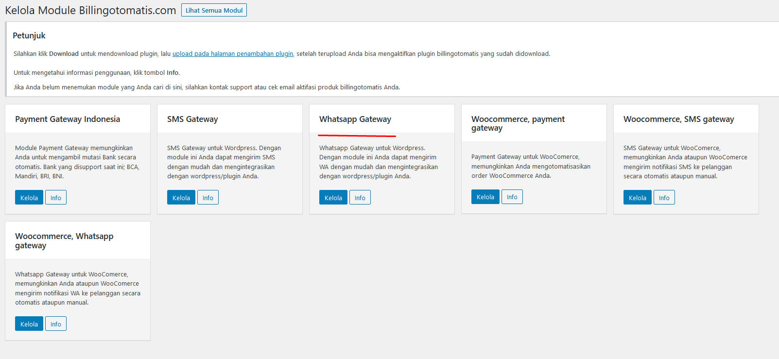 Setelah aktif silahkan klik sub module menu Billingotomatis, dan download serta upload ke wordpress Anda plugin Whatsapp Gateway nya: